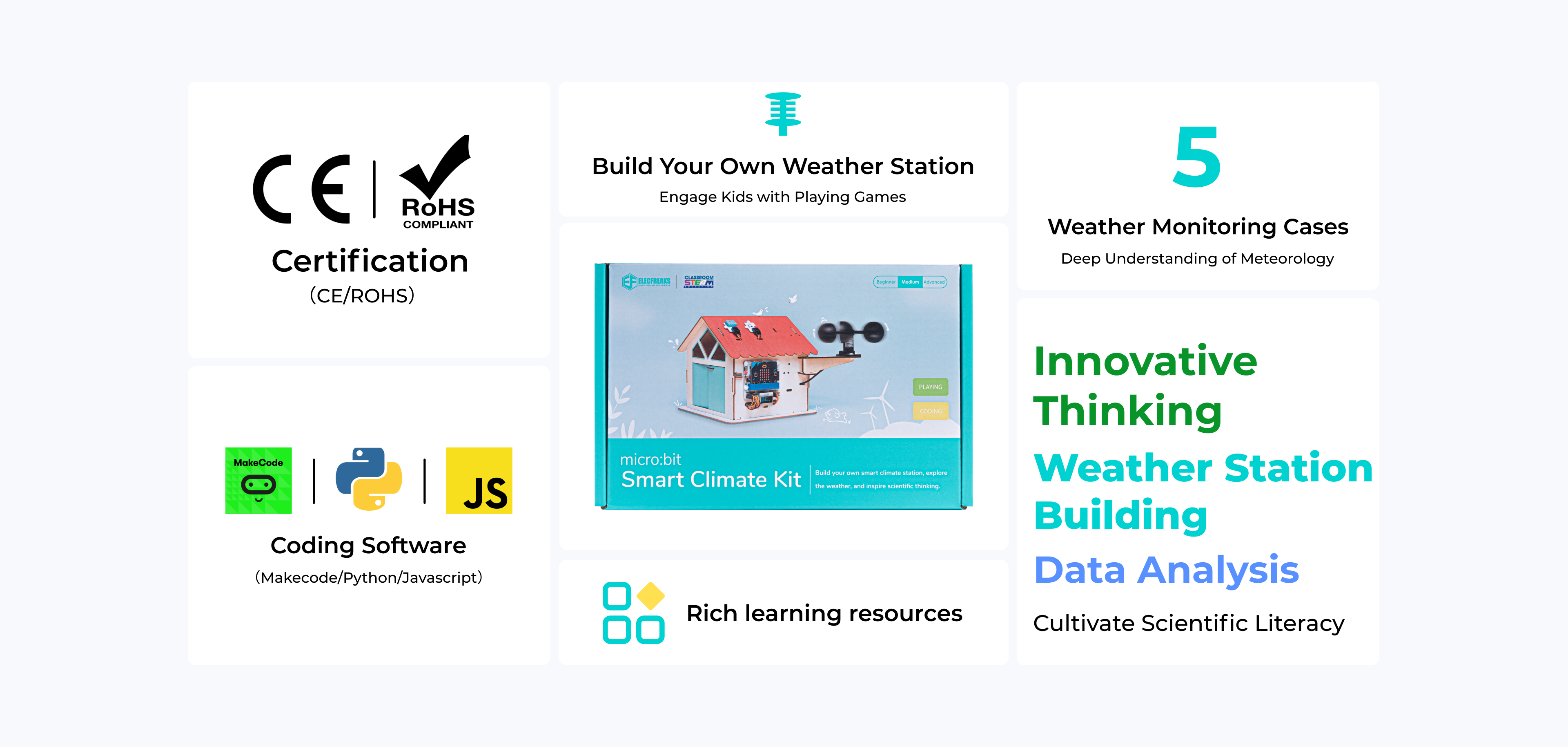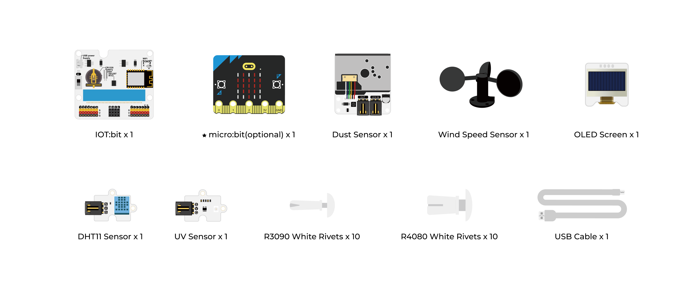 Smart Climate Kit is an innovative product designed based on micro:bit V2 and IOT:bit expansion board. Equipped with a variety of sensors such as wind speed sensor, temperature and humidity sensor, UV sensor, dust sensor, and OLED display, it can monitor and record a variety of environmental data in real-time. And upload the data to the cloud. The target of the Smart Climate Kit is to combine meteorological science and IoT technology to stimulate children's curiosity about natural phenomena and develop their scientific thinking and data analysis skills. Children can explore the mysteries of meteorology and understand the impact of weather changes on our daily lives through hands-on and real-time monitoring. This will not only help their learning and interest development but also cultivate their innovative thinking and scientific literacy, laying a solid foundation for their future in the field of science and technology.