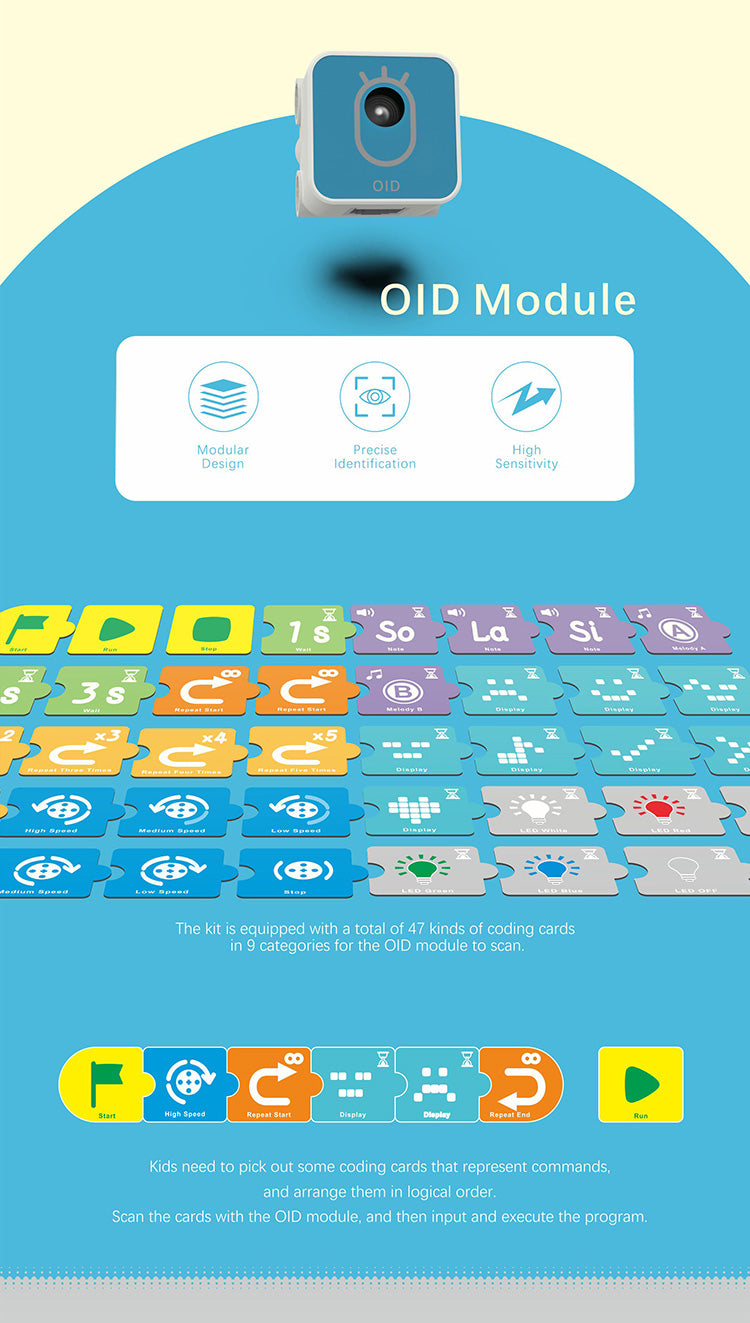ZMROBO a -Series Programming Robot Kit is equipped with a building blocks and electronic components, as well as sets of coding cards. Through scanning a series of coding cards, kids can program without computers, which is easy to learn and popularize, and makes programming become more friendly and more interactive. Building blocks are made in precise dimensions and comfortable to touch, allowing kids to assemble and disassemble robots easily. Electronic components are ready to use once connected, including High-Precision Motor, Dot Matrix Screen, Buzzers, Color Light, Button and so on, which enable the robot to realize functions such as motion, sound and light. The kit builds the robot's skeleton and muscles through blocks, composes the robot's nervous system through electronic components, and assigns logic to the robot's behavior through coding cards. lt provides students with entry-level robot design and programming, also fosters their hands-on skills, and helps them reach their creative potential.